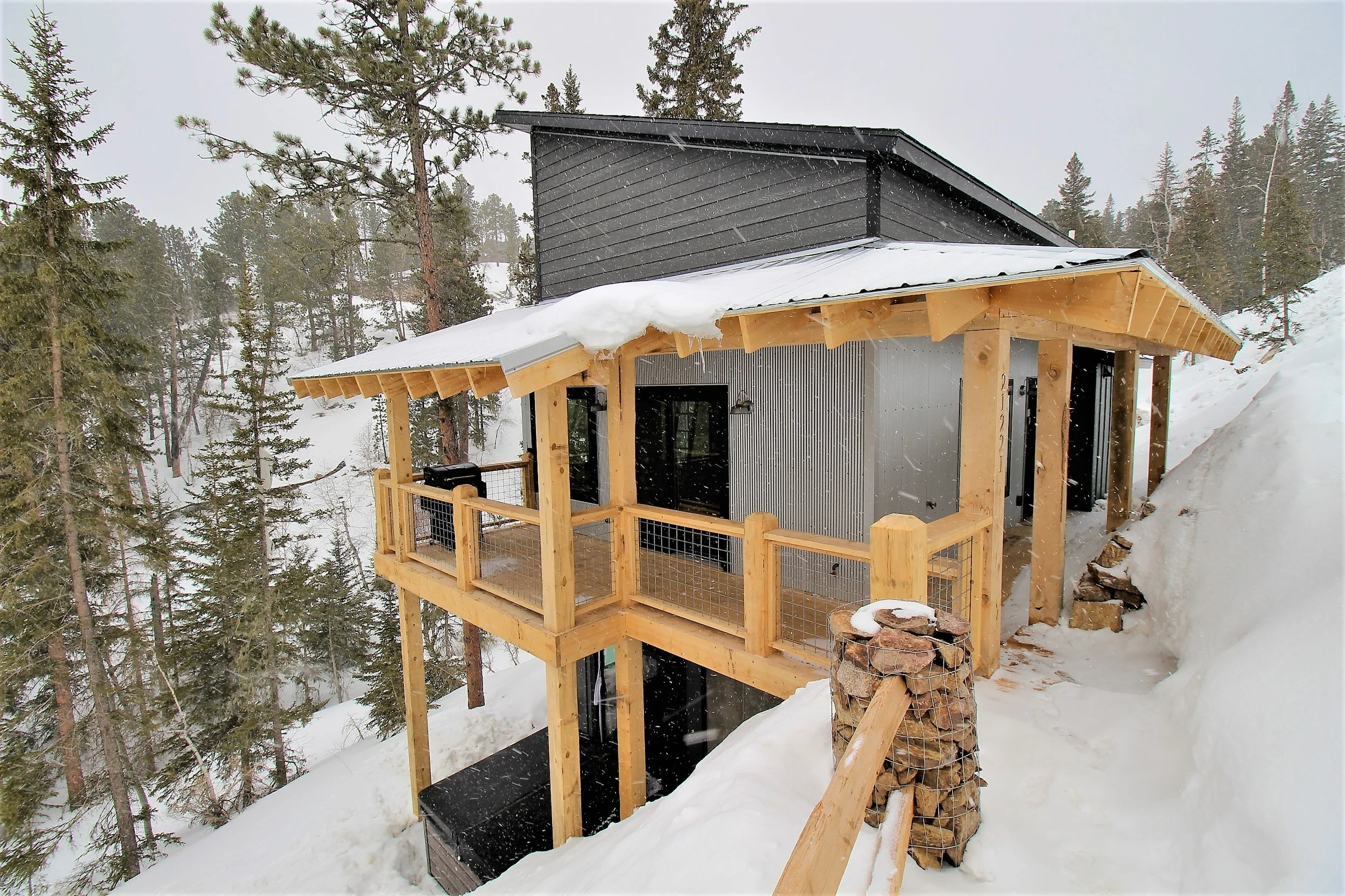 This mountain cabin is a touch of Contemporary Mid-Century Modern mixed with Rugged Mountain Cabin feel.Three stories of majestic Black Hills views with to enjoy on the HUGE patio. Each level is designed to manage a separate family, so THREE FAMILIES could share this home and enjoy some personal space with 1000 SF per level. The SIX PERSON HOT TUB is a great place to enjoy some adult time after the kids are asleep, or for the kids to soak after a long day of snow skiing or hiking. Parking for 5